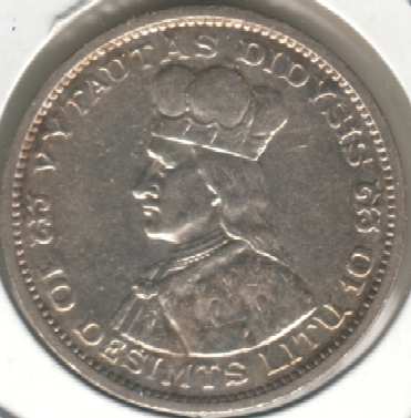 10 Litu (silver) 1936 83 a9t.jpg (17322 bytes) a9tx.jpg (12813 bytes) Grand Duke (Vytautas the Great) GEF 32.00