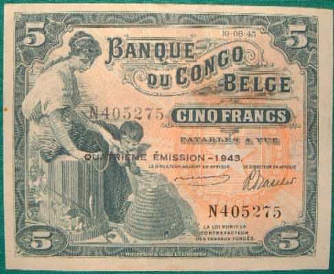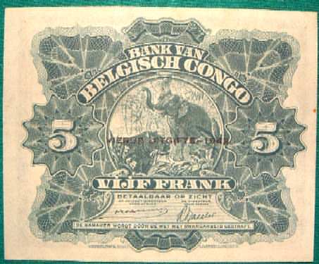 5 Francs 10.8.1943 13Ab belcongop13a.jpg (29002 bytes) belcongop13ax.jpg (27346 bytes) Beehive/Elephant & Hippo EF+ 95.00