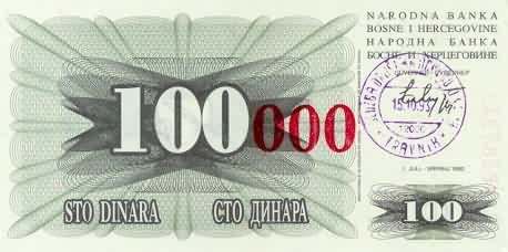 100000 Dinara 24.12.1993 56d bosniap56d.jpg (16772 bytes) Emergency issue large red zeros UNC 10.00