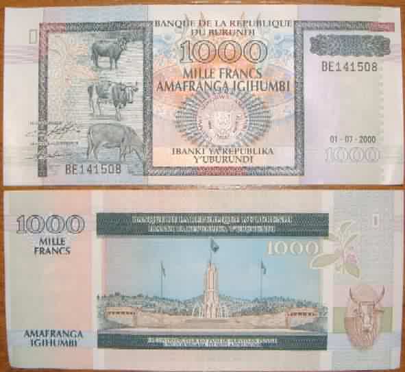 1000 Francs 1.7.2000 39c  burundinew1000francsyr2000.jpg (23070 bytes)   AU+ 4.50