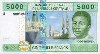 5000 Francs 2002 209U  casnew5000francsu.jpg (11233 bytes)  casnew5000francsux.jpg (11800 bytes) U for Cameroon  Ships at Port Dockside UNC 16.50